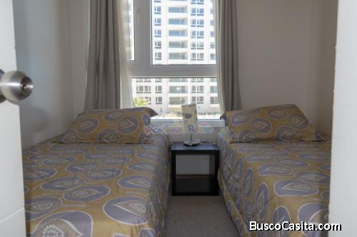 Dormitorio principal con terraza independiente en suite, con baño completo con tina, cama matrimonial (2 plazas), closet y terraza independiente, Segundo dormitorio dos camas individuales (2 camas de 1 plaza cada una), tercer dormitorio con dos camarotes (4 camas de 1 plaza cada una), ambos también poseen closet, Segundo baño con tina.