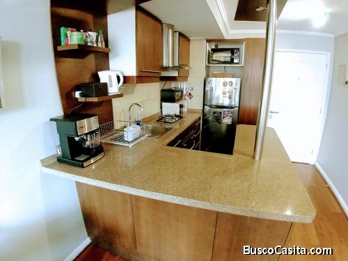- Cocina americana amoblada y equipada con horno, encimera y campana.