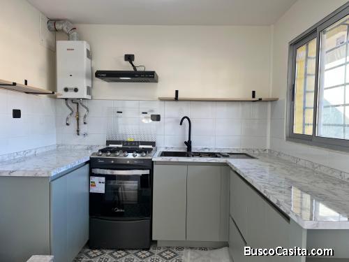 Cocina amoblada a estrenar: mobiliario y superficies nuevos, cocina (artefacto) nueva y calefont nuevo.