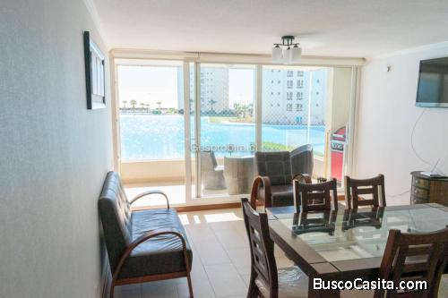 Departamento con excelente vista y ubicación en playa grande de Papudo, en gran Condominio con laguna artificial navegable, con salida directo a la playa, amplias áreas verdes, canchas de tenis y futbolito, sala de eventos, piscinas. Condominio cercano a CESFAM (centro de salud familiar), almacenes, botillerias, feria de frutas y verduras, marisquería, pescadería, y mucho más.