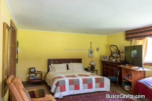 Distribución: En entrada a la parcela hay una terraza tipo pérgola con enchufes. Tinajas de la época de la colonia 1860. Hall de acceso. Cocina amoblada, piso de porcelanato. Cocina cuenta con puerta acceso a living. Logia exterior techada y dormitorio de servicios con baño. Living muy amplio con chimenea, grandes ventanas y acceso de salida a terraza techada. Espectacular comedor con conexión a living y dos salidas una a terraza techada y otra hacia adelante de la casa. Amplio y extenso pasillo que lleva a las habitaciones del hogar. Dormitorio principal en suite, de 45 mts2, completamente alfombrado, con chimenea, walking closet y terraza techada independiente, el baño es muy espacioso, con lavamanos doble, tina y esta hecho con mármol. Además posee ventilación natural (ventana). Tres dormitorios con closet y ventana, se encuentran alfombrados. Segundo Baño completo con tina, también tiene mármol, y ventana de ventilación. Closet de pasillo fuera del segundo baño ideal para guardar toallas. Posee entre-techo. Club House: Quincho, horno de barro y mesones de durmiente en exterior. En interior cuenta con bar, mesa de pool, proyector y un baño con ducha. También aquí se encuentra el espacio usado como escritorio pero además puede ser usada como otra pieza de servicios. Piscina de 4 x 8 mts. Reposeras y un deck. Una gran bodega con repisas tipo closet. y otra bodega tipo pasillo con repisas. Casa de muñecas. Otros: Tablero independiente en Casa y Club house/bodega. Riego manual por sectores. Estacionamiento techado para 2 vehículos. Estanque de gas de 500 lts. de abastible. Tiene ablandador de agua para consumo de 10 personas, lavadora y calefón. Cuenta con 2 pozos de agua usados para el riego. Posee doble cerco. Puertas de pino oregon, canelo, raulí. Portón acceso automático-eléctrico. 1910LAMVEN103