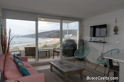Gran y maravilloso Departamento semi nuevo en Venta con vista al mar en primera línea, en exclusivo condominio Punta del Rey con áreas verdes, juegos infantiles, cancha de tenis y futbolito, gran sala de eventos, con un muy cómodo quincho, fogón, mesa de ping-pong y taca taca, el condominio colinda con la laguna natural de Papudo, también tiene salida con acceso directo a la playa, Piscina y jacuzzi.