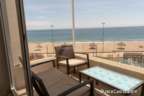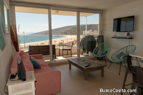 Gran y maravilloso Departamento semi nuevo en Venta con vista al mar en primera línea, en exclusivo condominio Punta del Rey con áreas verdes, juegos infantiles, cancha de tenis y futbolito, gran sala de eventos, con un muy cómodo quincho, fogón, mesa de ping-pong y taca taca, el condominio colinda con la laguna natural de Papudo, también tiene salida con acceso directo a la playa, Piscina y jacuzzi.