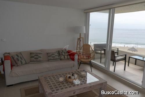 Gran Departamento frente al mar en Venta, en primera línea, en sector Punta Puyai en exclusivo condominio Punta del Rey, con gran sala de eventos, un muy cómodo quincho, fogón, mesa de ping-pong y taca-taca, con extensas áreas verdes, juegos infantiles, cancha de tenis y futbolito, el condominio colinda con la laguna natural de Papudo, también tiene salida con acceso directo a la playa, Piscina y jacuzzi.