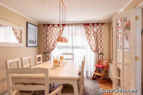 Distribución: Primer piso: Hall acceso. Baño de visitas. Un dormitorio de servicio con baño completo, y closet. Living y comedor divididos con mampara de madera, ambos con ventanales de aluminio. Comedor con puerta de acceso a cocina. Cocina amoblada y equipada con horno empotrado marca teka, encimera a gas, campana marca fensa. Comedor de diario, amplio espacio para refrigerador. Logia exterior techada con lavadero y muebles, posee acceso a cocina, ante-jardín y patio trasero. Gran patio con piscina, pasto natural, riego automático, terraza techada, pasillo con acceso a ante-jardín. Dormitorio principal en suite ampliado, con baño completo con tina y ventana, posee closet y cuarto de transición o home office u otro uso. Segundo Piso: Sala de estar + Espacio escritorio, con calefacción. Closet en pasillo. Baño completo con ventana. Tercer dormitorio con closet y balcón. Cuarto y Quinto dormitorio con closet. Otros: Pisos living comedor: piso flotante. Pisos cocina, hall de acceso baños: cerámica. Piso terraza: porcelanato. Agua caliente: calefont. Calefacción en living, comedor, sala de estar y habitaciones: caldera. Casa construida año 2004. Condominio: con accesos controlados, cámaras de vigilancia, Seguridad ADT, estacionamientos de visitas, extensas áreas verdes, juegos infantiles, salón de eventos, cancha de tenis y multicancha, gimnasio. 1908HUEVEN99