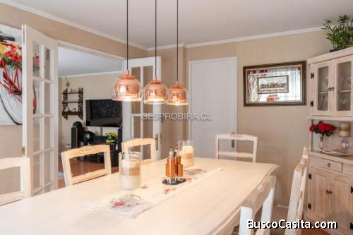Distribución: Primer piso: Hall acceso. Baño de visitas. Un dormitorio de servicio con baño completo, y closet. Living y comedor divididos con mampara de madera, ambos con ventanales de aluminio. Comedor con puerta de acceso a cocina. Cocina amoblada y equipada con horno empotrado marca teka, encimera a gas, campana marca fensa. Comedor de diario, amplio espacio para refrigerador. Logia exterior techada con lavadero y muebles, posee acceso a cocina, ante-jardín y patio trasero. Gran patio con piscina, pasto natural, riego automático, terraza techada, pasillo con acceso a ante-jardín. Dormitorio principal en suite ampliado, con baño completo con tina y ventana, posee closet y cuarto de transición o home office u otro uso. Segundo Piso: Sala de estar + Espacio escritorio, con calefacción. Closet en pasillo. Baño completo con ventana. Tercer dormitorio con closet y balcón. Cuarto y Quinto dormitorio con closet. Otros: Pisos living comedor: piso flotante. Pisos cocina, hall de acceso baños: cerámica. Piso terraza: porcelanato. Agua caliente: calefont. Calefacción en living, comedor, sala de estar y habitaciones: caldera. Casa construida año 2004. Condominio: con accesos controlados, cámaras de vigilancia, Seguridad ADT, estacionamientos de visitas, extensas áreas verdes, juegos infantiles, salón de eventos, cancha de tenis y multicancha, gimnasio. 1908HUEVEN99