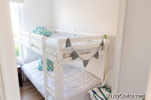 Dormitorio principal en suite, con baño, piso flotante, closet incluye cama de dos plazas con respaldo capitone más colchón y cortina roller. Segunda habitación cuenta con closet, piso flotante e incluye una litera con colchones y cortina roller. Tercer dormitorio cuenta con closet, piso flotante e incluye una litera con colchones y cortina roller. Baño completo. Cocina americana con campana, horno y encimera eléctrica, además incluye refrigerador. Amplio living-comedor incluye muebles y cortina roller.