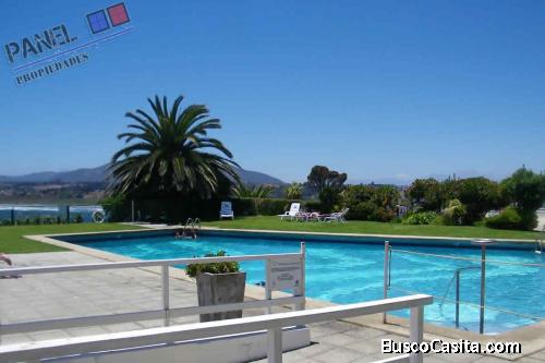 Condominio de 8.000 m2 con jardines que presentan una hermosa vista al mar, cuenta con servicios de sala multiuso, piscina y vigilancia 24 hrs.
